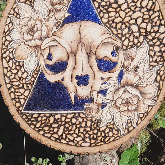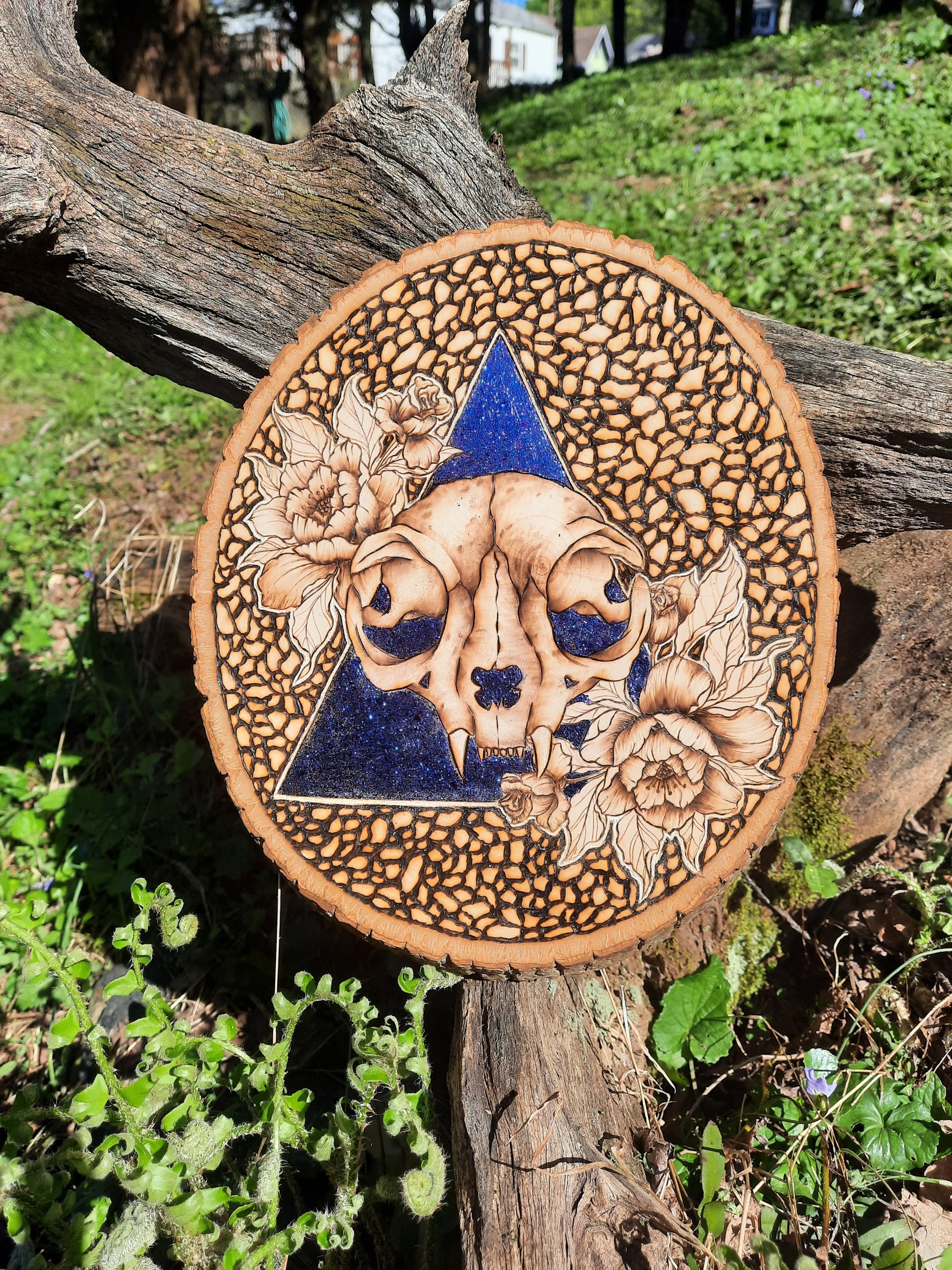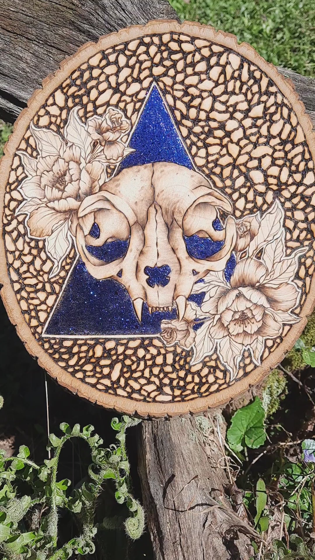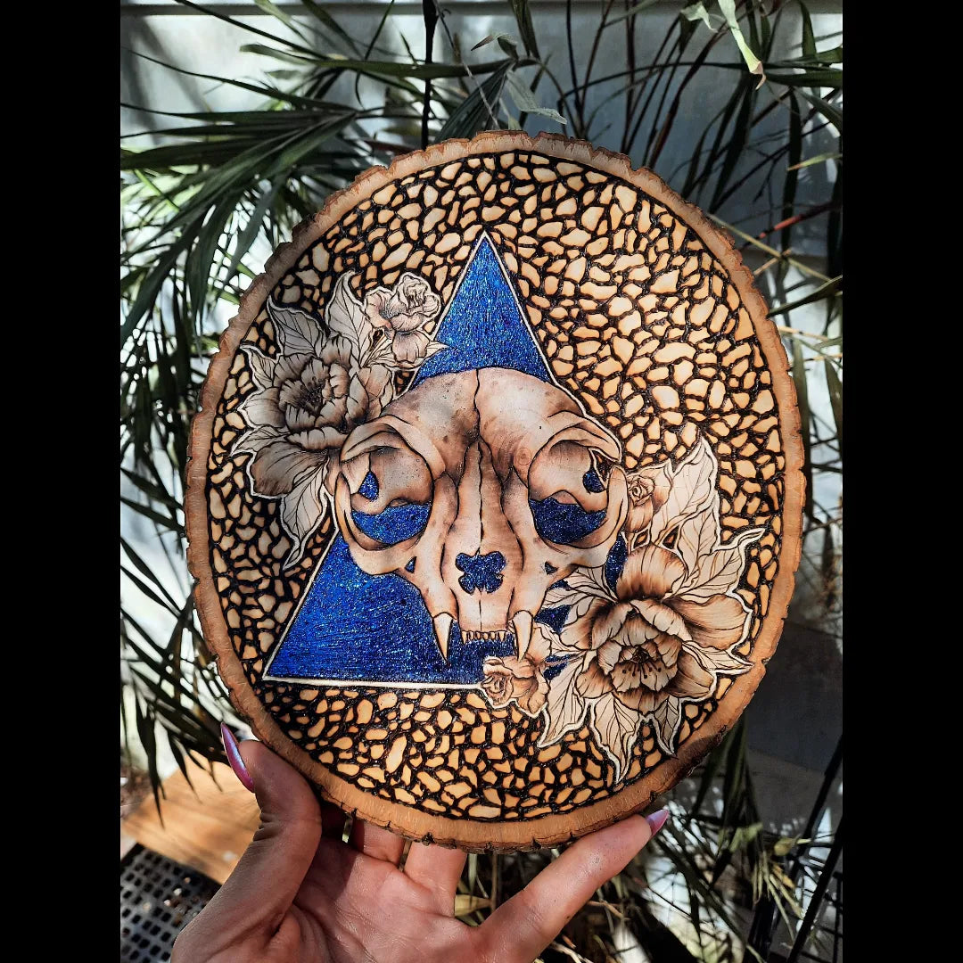 Cats Bloom combines wood burning and geometric designs to create a unique skull adorned with vibrant flowers and intricate textures. Add a touch of nature and edginess to your home decor with this one-of-a-kind piece.